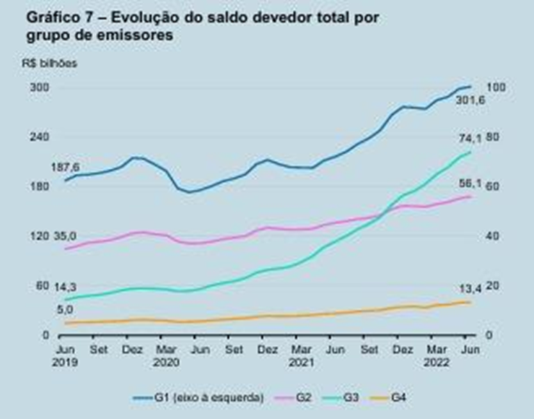 O gráfico abaixo mostra como o endividamento das pessoas físicas no cartão de crédito aumentou ao longo do período entre junho de 2019 e 2022 – sendo que o indicador mais expressivo fica com o salto de R$ 14,3 bilhões para R$ 74,1 bilhões no saldo devedor registrado pelas fintechs, tendo em vista a facilidade em se obter cartões de crédito por meio dos bancos eletrônicos em relação às instituições tradicionais.
