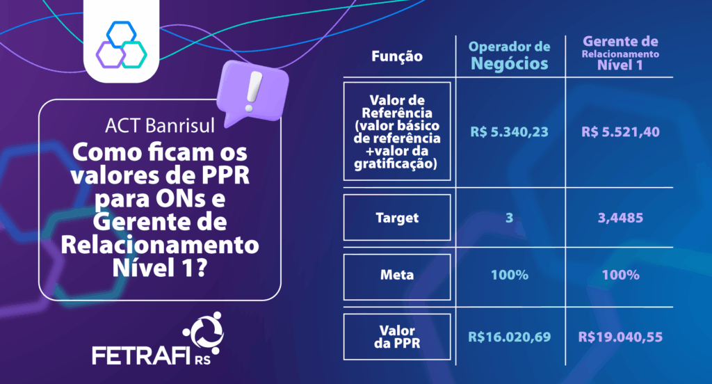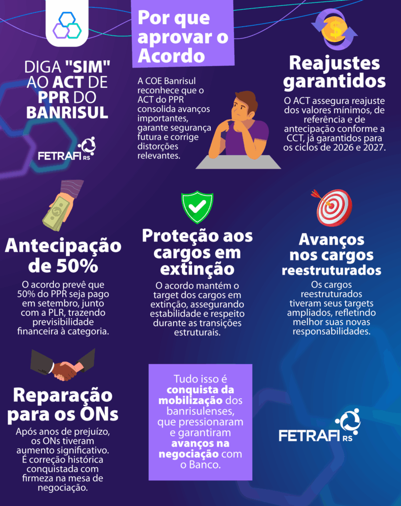 As assembleias sobre o ACT do PPR 2026–2027 acontecem a partir de hoje (11), e a Fetrafi-RS reuniu dois infográficos para subsidiar os empregados do Banrisul com informações claras e objetivas sobre a proposta apresentada pelo Banco. O objetivo é oferecer transparência e apoiar a categoria na tomada de decisão.