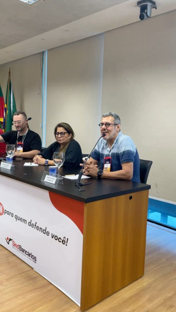 O debate também abordou o contexto de intensificação dos ataques aos trabalhadores, com o uso da tecnologia para reduzir custos, ampliar o controle e eliminar postos de trabalho. “Esse processo tem provocado o encolhimento da categoria bancária e da base sindical, agravado pela reforma trabalhista. Apesar de alguns avanços recentes, como a taxa negocial, o direito de oposição individual volta a ameaçar as formas de financiamento coletivo das entidades”, enfatizou Bacelo.