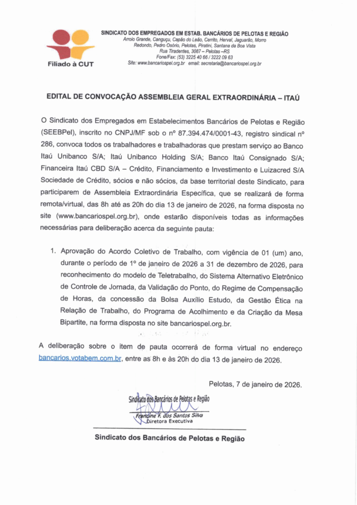 O Sindicato dos Bancários de Pelotas e Região convoca os bancários e bancárias que prestam serviço ao Banco Itaú Unibanco S/A; Itaú Unibanco Holding S/A; Banco Itaú Consignado S/A; Financeira Itaú CBD S/A – Crédito, Financiamento e Investimento e Luizacred S/A Sociedade de Crédito, para Assembleia Geral Extraordinária, que será realizada virtualmente/remotamente, entre as 8h e as 20h do dia 13 de janeiro de 2026, pela plataforma Votabem, no link bancarios.votabem.com.br. Confira o edital ao final da matéria.