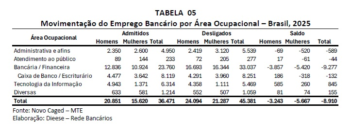 Entre todas as áreas ocupacionais do banco, a de Tecnologia da Informação (TI) foi uma das poucas com saldo positivo. Em 2025, foram 6.314 admissões e 5.469 demissões, resultando na abertura de 845 vagas. O Dieese pontua também que a contratação de homens foi predominante nesta área, correspondendo a 78,3% contra 21,7% de mulheres.